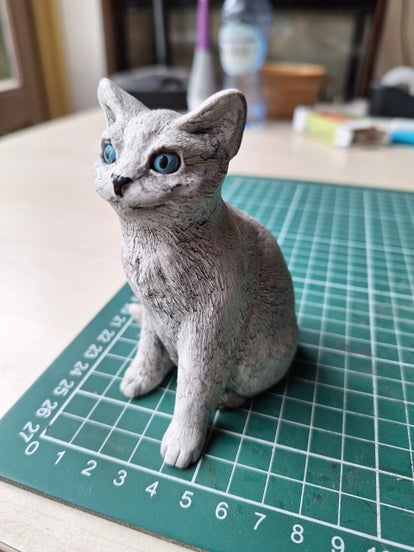 Beeldje van een langharige kat met blauwe ogen, 6cm hoog.